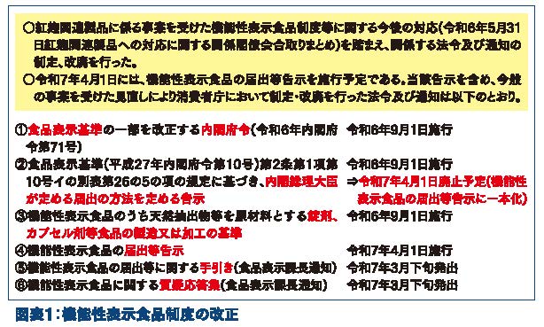 令和6年3月に、小林製薬㈱の紅麹関連製品について健康被害の発生が報告された。消費者庁としては、同年5月31日に開催された「紅麹関連製品への対応に関する関係閣僚会合」における取りまとめを踏まえ、機能性表示食品制度の見直しを行った(図表1)。以下、詳細について説明する。