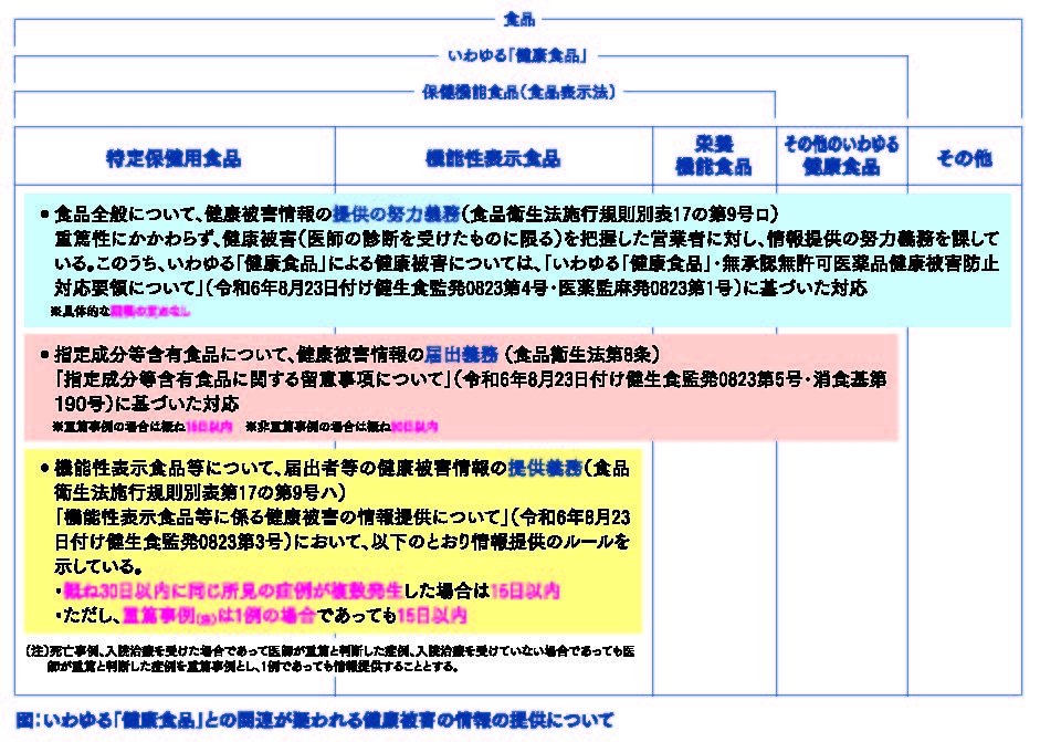 従前から食品等事業者には、健康被害と疑われる情報を把握した場合に都道府県知事等へ情報提供するという努力義務が課されています。今回の改正では、この食品全般に係る情報提供の努力義務を維持したまま、食品衛生法に基づく食品衛生法施行規則別表第17において、「営業者のうち、機能性表示食品の届出者及び特定保健用食品に係る許可を受けた者は、これらの食品による健康被害に関する情報を収集するとともに、健康被害の発生及び拡大のおそれがある旨の情報を得た場合には、速やかに、当該情報を都道府県知事等に提供すること」を定めました。これにより、機能性表示食品及び特定保健用食品について、従来は努力義務だった健康被害の情報提供を義務化したことになります。また、「機能性表示食品等に係る健康被害の情報提供について」(令和6年8月23日付け健生食監発0823第3号)において、情報提供までの期間について、「概ね30日以内に同じ所見の症例が複数発生した場合」及び「1例の場合であっても重篤例」は、15日以内とすることを示しています(図)。