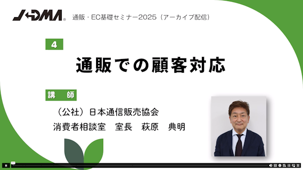 「通販・EC基礎セミナー」は、業界動向や関連法令(景表法・特商法)、通販の顧客対応、セキュリティなど、通販・EC業務に関わる基礎知識を短期間でまとめて学習できる、業界で必須の知識を学ぶオンラインセミナーです。